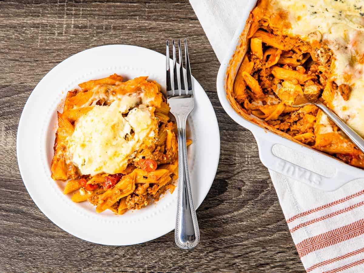 This easy baked ziti with ground turkey is delicious Italian American comfort food with a hearty flavorful meat sauce, tender noodles, and plenty of gooey cheese. It's perfect for a family dinner and makes great freezer meals too! Get the Baked Ziti with Ground Turkey recipe here.