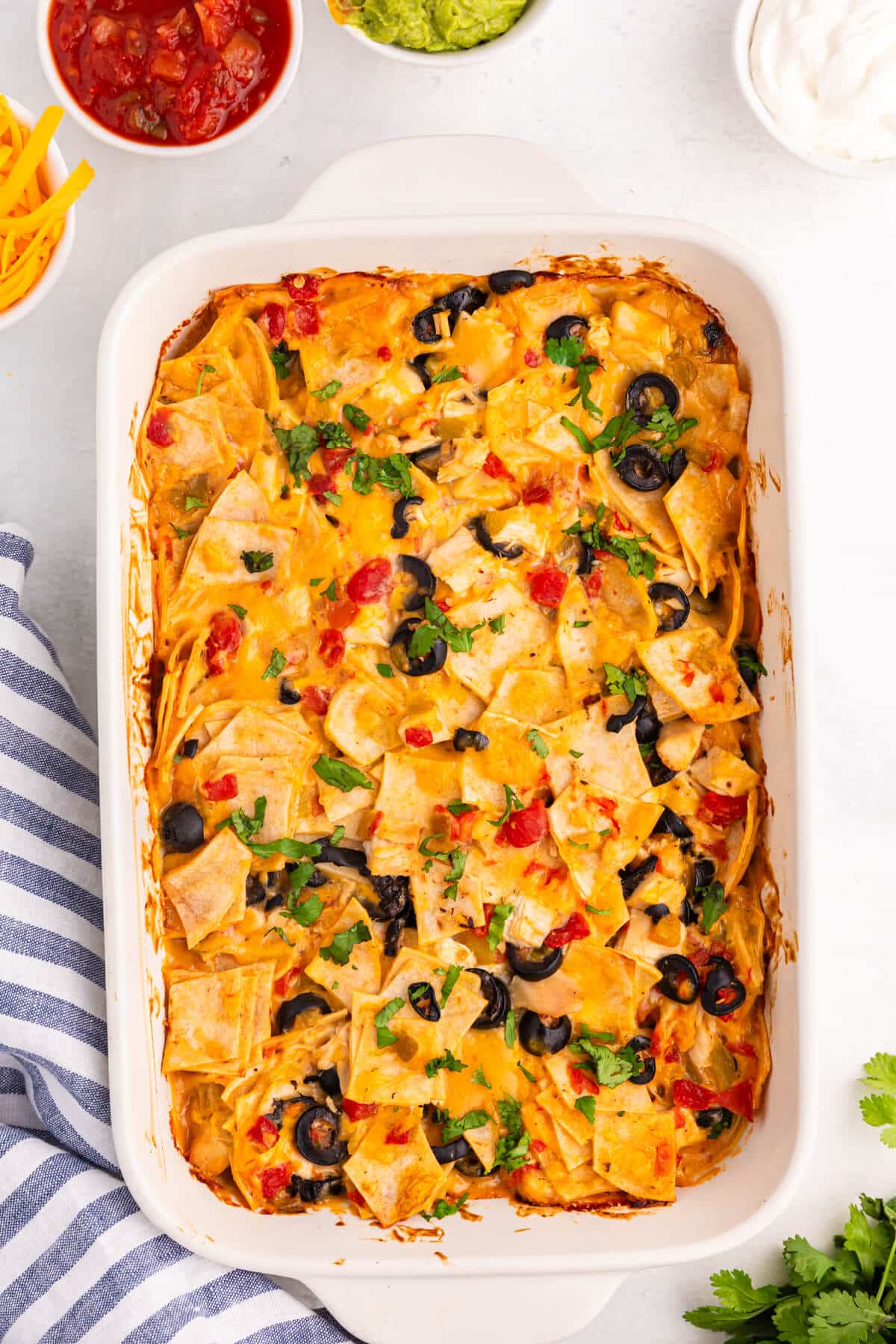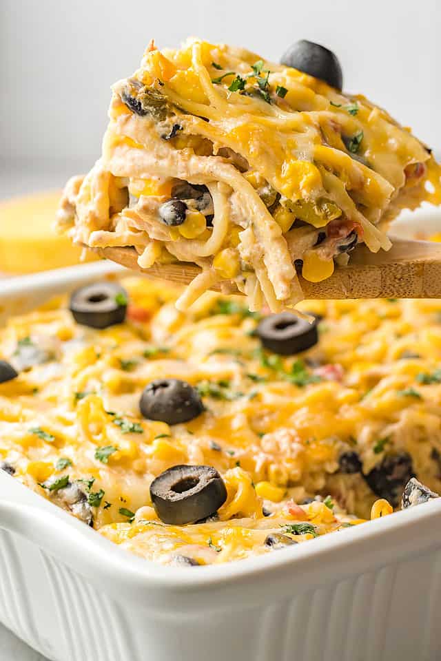 With creamy chicken, cheese, rotel, and corn tortillas, this recipe is an easy dump-and-bake casserole that the whole family will love.
