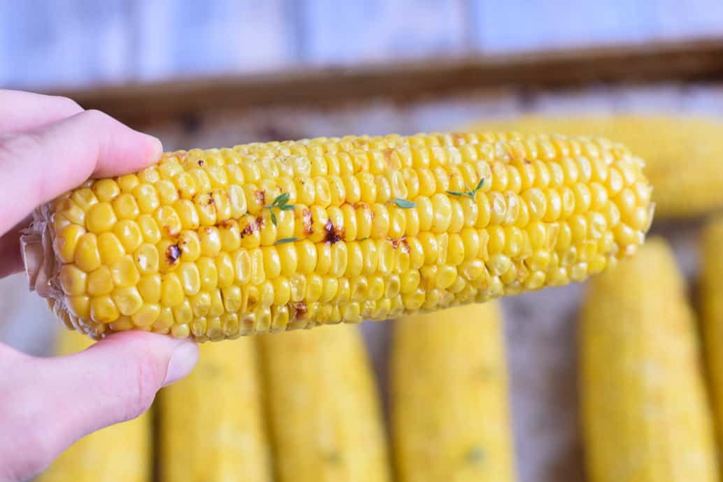 Roast the corn in the preheated oven for about 20 minutes or until tender. Remove from oven and slightly cool. Garnish with fresh thyme leaves.