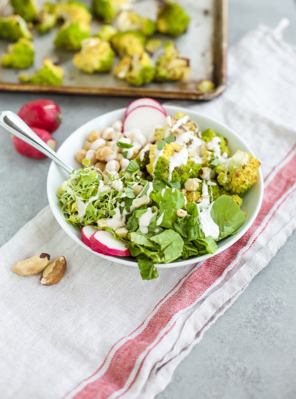 This Roasted Cauliflower Bowl is filled with summer seasonal goodies. It's packed with good for you cauliflower, chickpeas, sprouts, and arugula. Topping it with a creamy dressing and brazil nuts ensures you get some fat to keep you full. {gluten free, vegan}