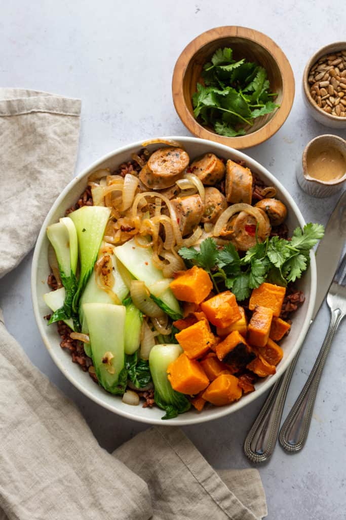 - Place cooked rice in a bowl and add the sausage and vegetable mixture. Top with your roasted butternut squash and drizzle with the tahini dressing. Garnish with fresh herbs and sunflower seeds.