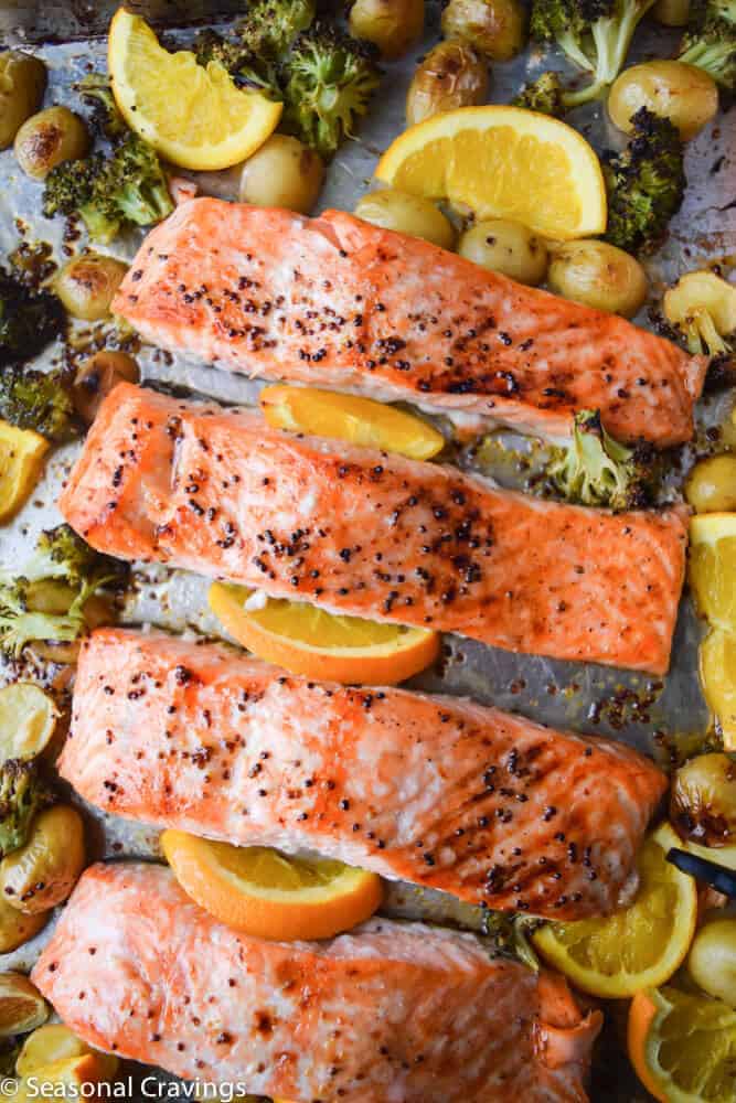 Pat salmon dry with paper towels. Place salmon fillets skin side down on a rimmed baking sheet. Add vegetables to the pan, spreading them evenly in a single layer around the salmon.