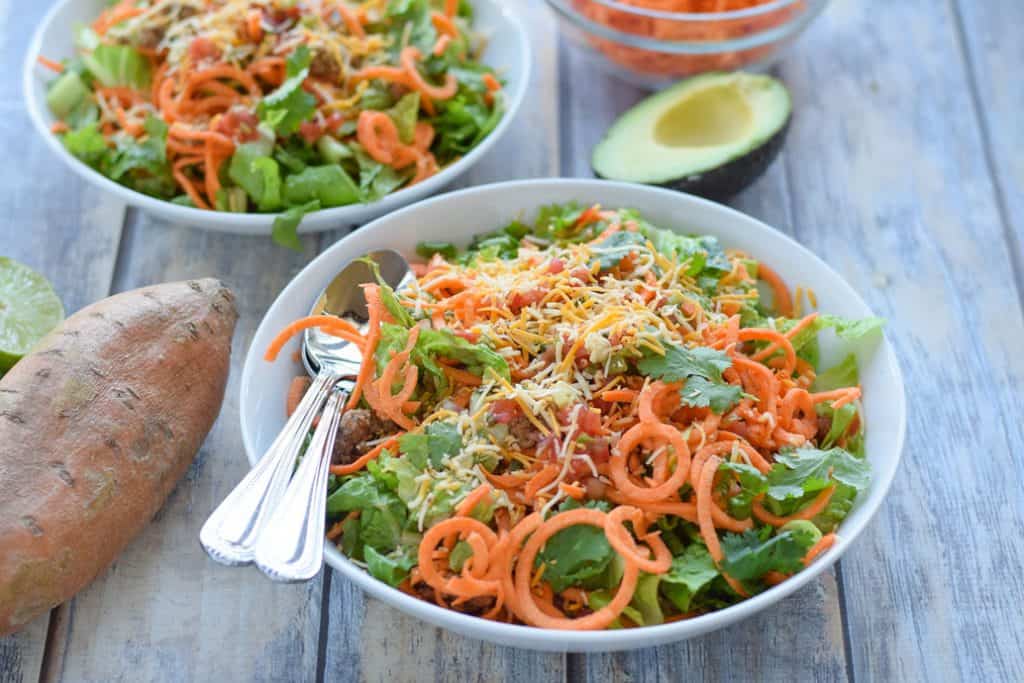 Try this fun twist on a boring taco salad by adding sweet potato noodles. They are packed with vitamins and add a nice sweetness to this Sweet Potato Noodle Taco Salad. (gluten-free)